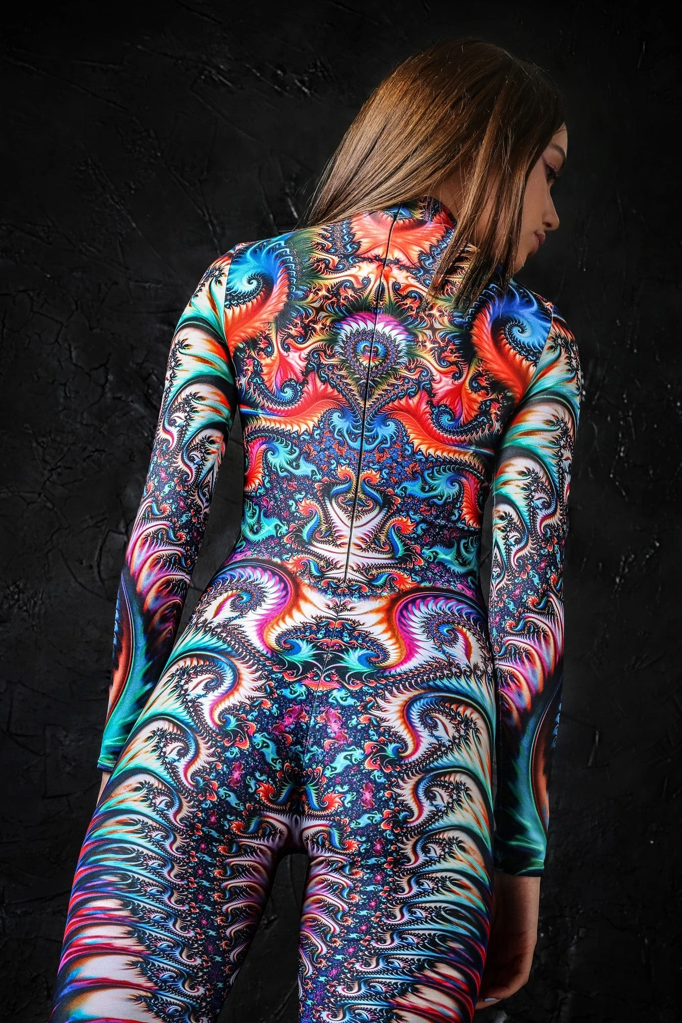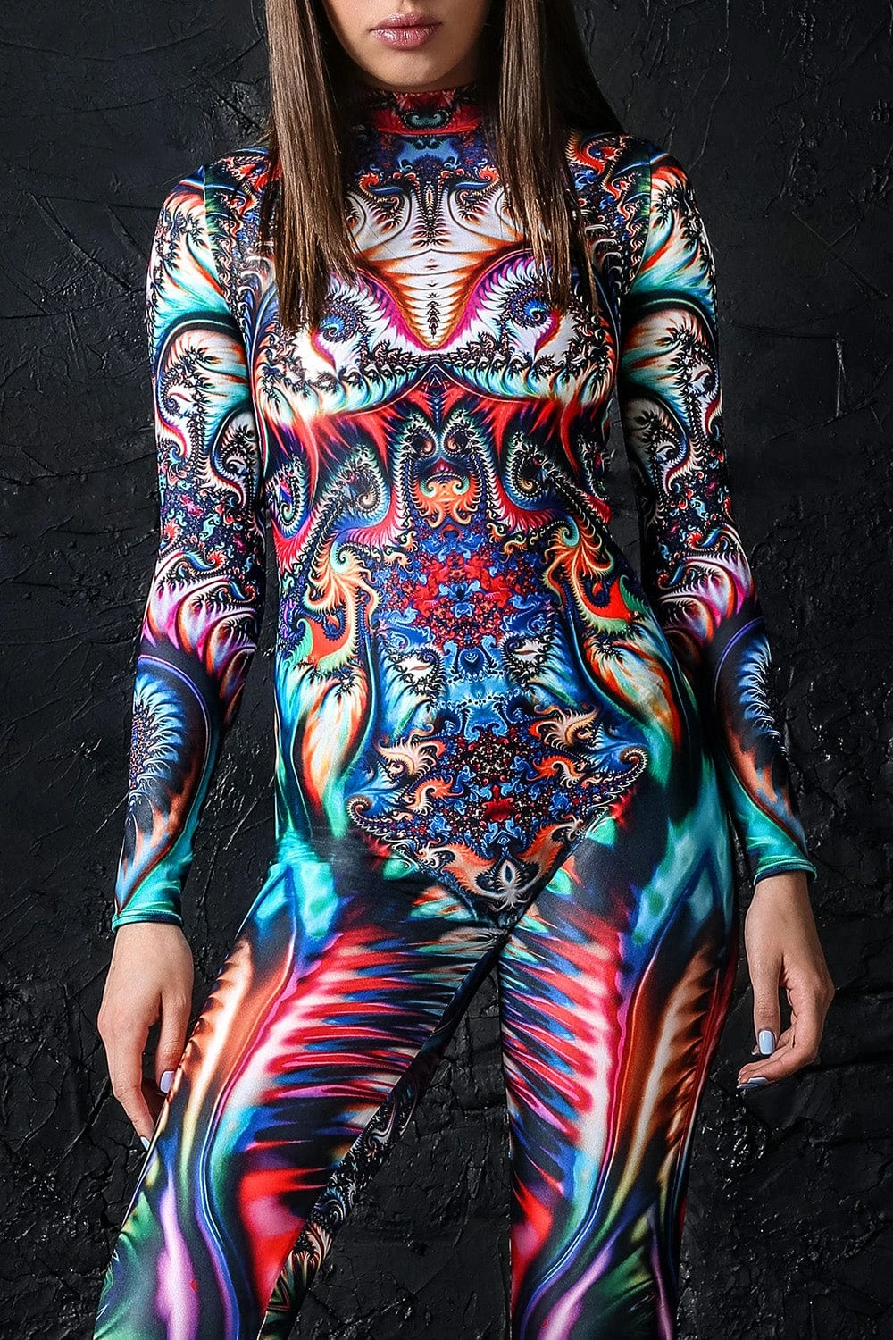 This piece is made from a high quality stretchy and breathable Lycra fabric, that feels wonderful on the skin. It’s printed with outstanding graphics that react to UV light, so you can literally glow.