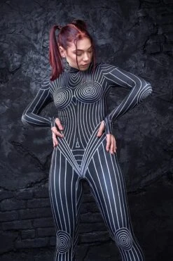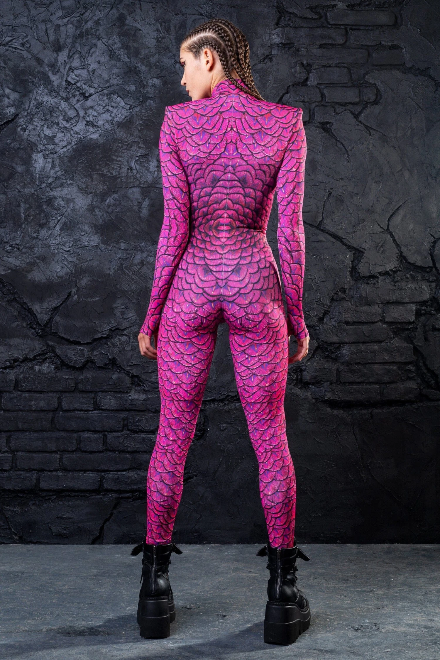 The design features a body con fit, padded shoulders, long sleeves with thumbholes, a mock neckline and a sturdy black zipper in the front.