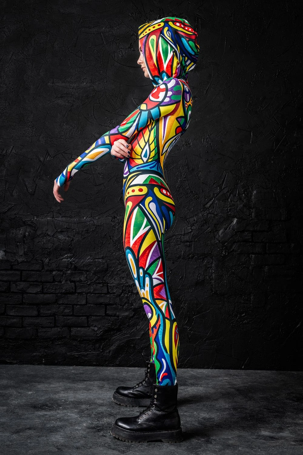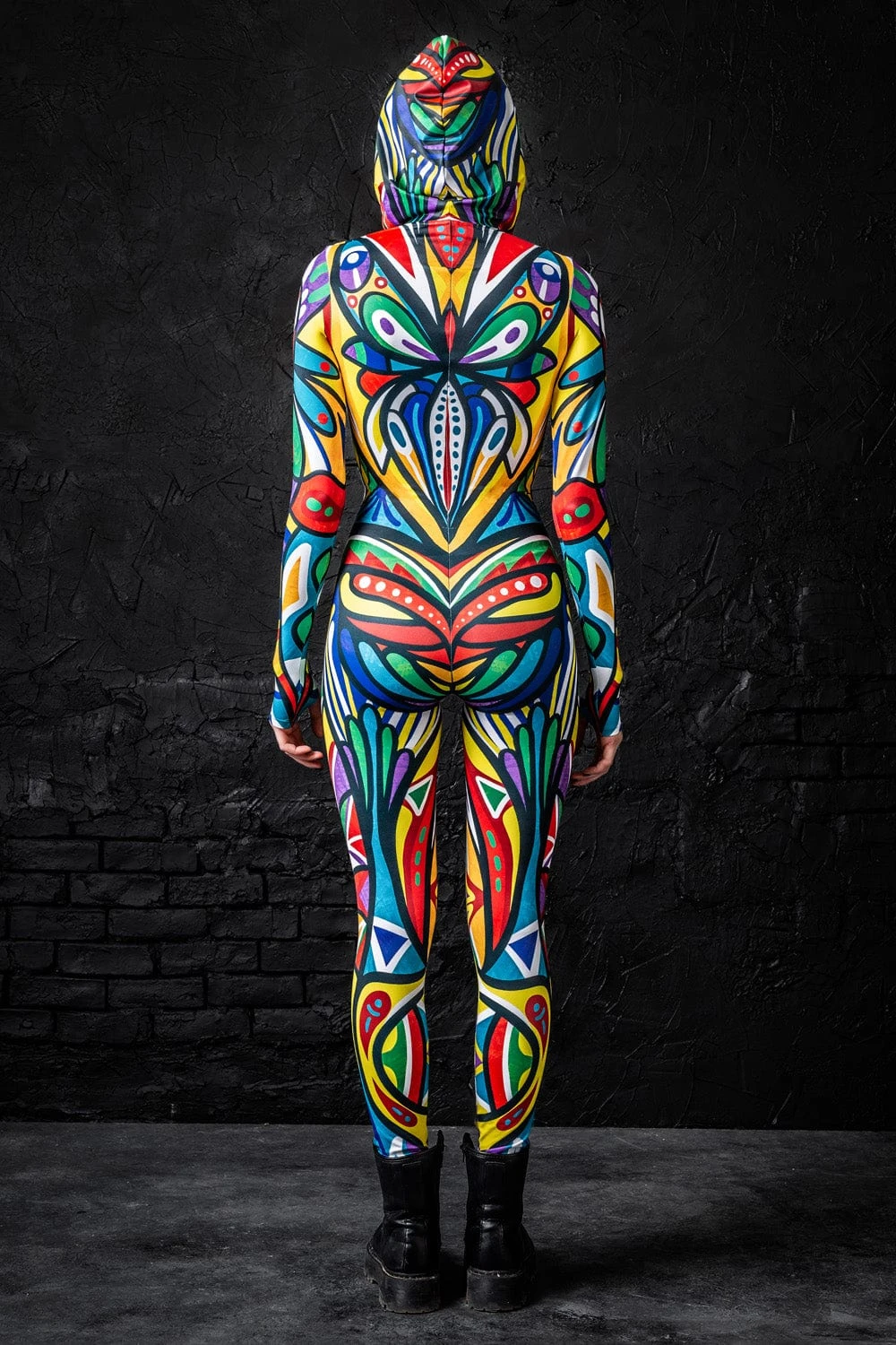 Trippy mixed with tribal makes for a one of a kind festival outfit. The Psy Vance Fit Onesie is an odyssey of color and form and an absolute showstopper.Â
