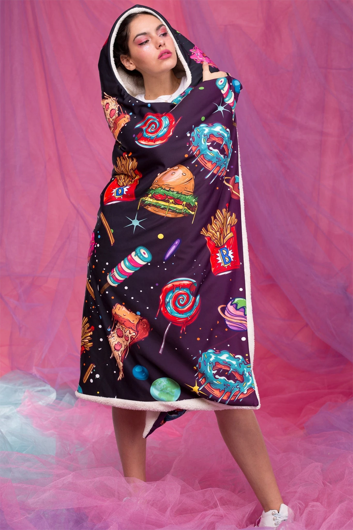 Wearing the Space Munchiez Hoodie Blanket is a one of a kind, mouth drooling experience, which feels very much like floating in 0 gravity, while munching a burger or a slice of pizza.