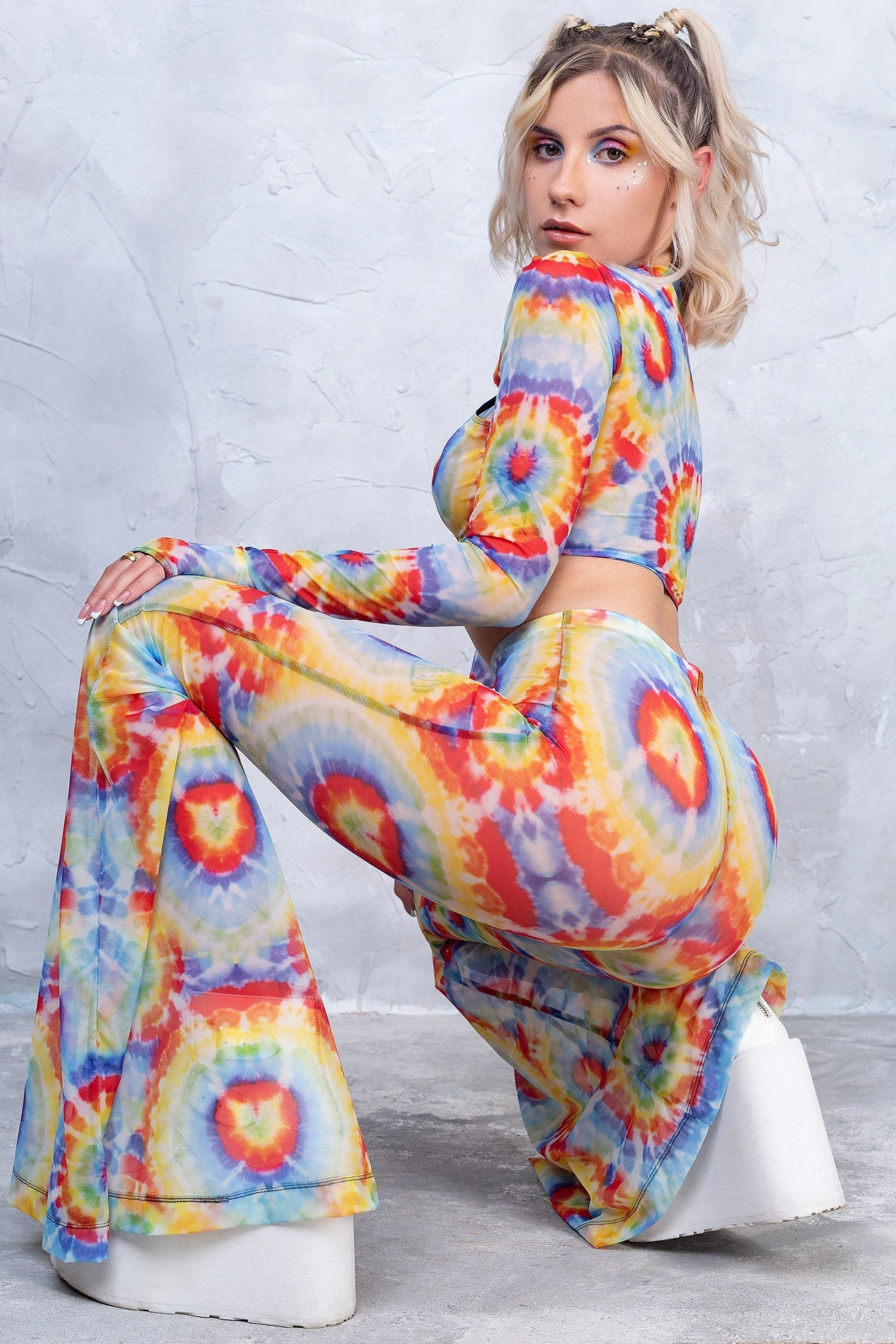The design features a high waist and a wide leg. Pair with the tie Dye Sleeved Crossed Mesh Top for a complete look.